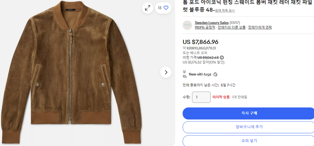 톰포드 아이코닉 펀칭 스웨이드 봄버 재킷 【매장-1100만원대】