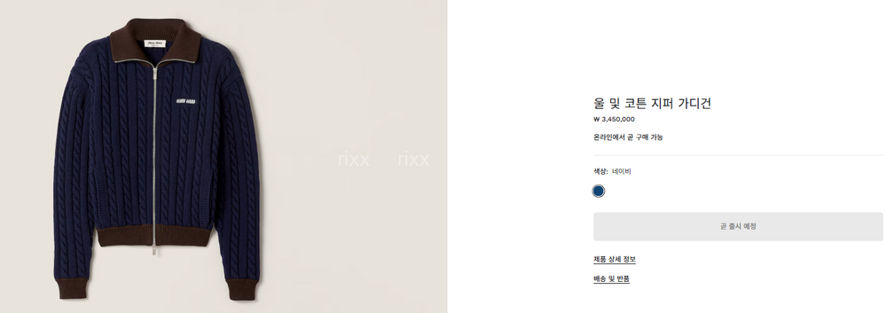 미우미우 울 및 코튼 지퍼 가디건 【매장-350만원대】